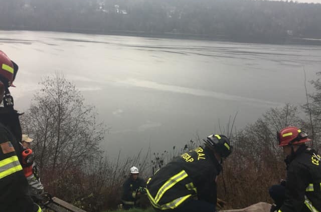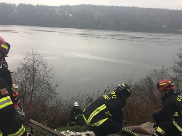 Central Kitsap Fire and Rescue crews were called to rescue a dog approximately 60’ down a 120’ high bank cliff. Crews from Central Kitsap Fire and Rescue, Poulsbo Fire, and South Kitsap Fire and Rescue, went down to retrieve Bubba, a 60lb pit bull mix, on rescue ropes. Bubba eventually made his way back up the slope under his own power.